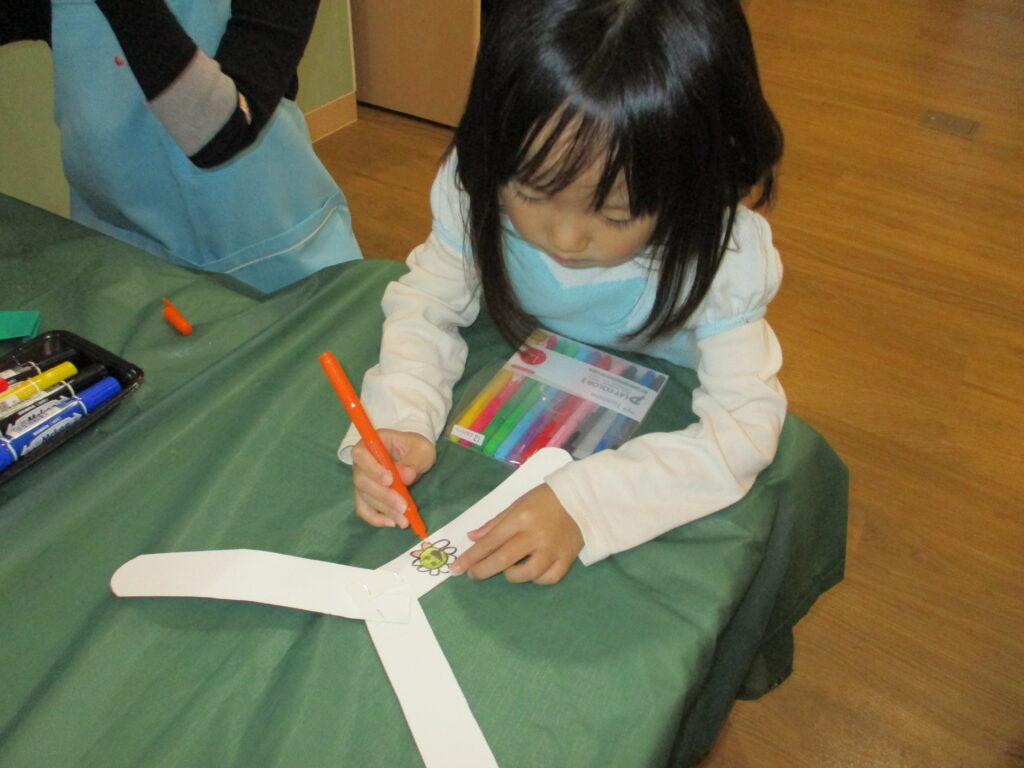 それぞれ好きな遊びを見つけて楽しんでいますね!大根に興味津々のお友だち、ブーメラン作りに夢中なお友だち‥ 二人とも真剣な表情です‼