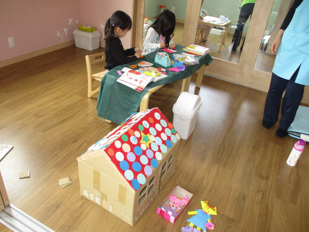 「お家が欲しい❣」ということで保育士と3人、役割分担をして猫ちゃんのお家を作りました🏠どんどん遊びが膨らんで、お家の中にはベッド、テーブル、お皿に入ったミルク、ご飯も完備されましたよ👍
