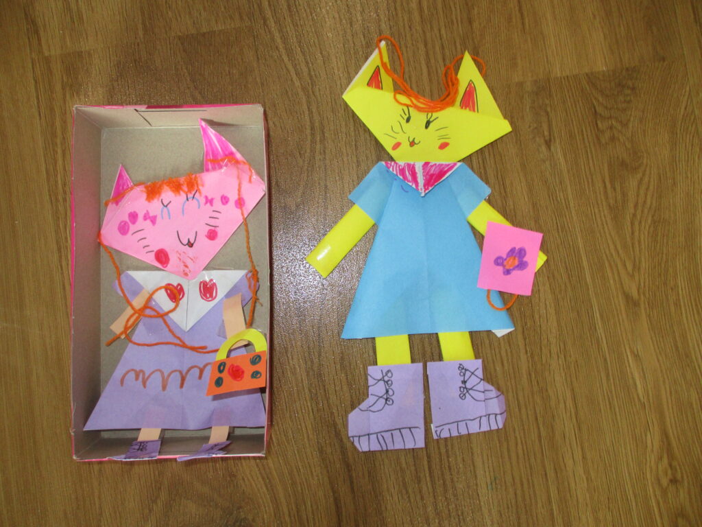 顔、ワンピース、ブーツ・・・折り紙の本を見ながらパーツを作り合体‼それぞれ思い思いに作りあげ、こんなに可愛い猫ちゃんが完成❣